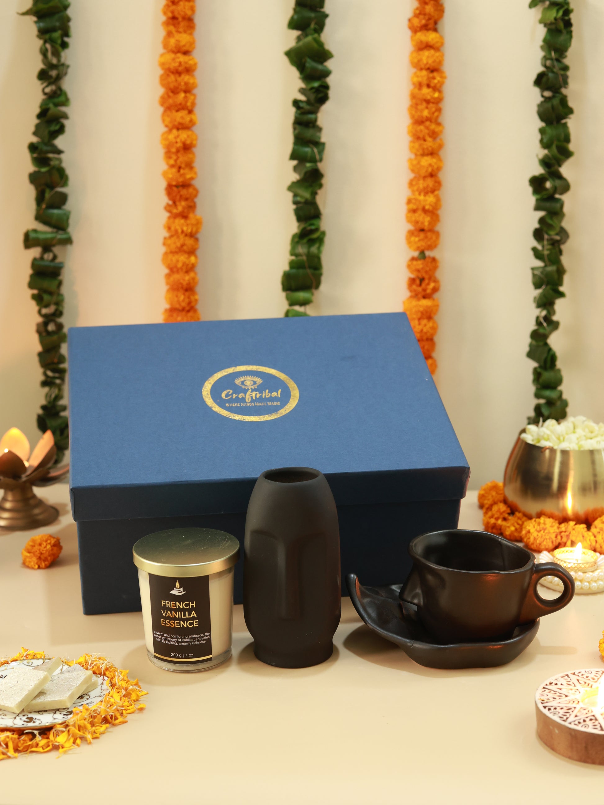 Elevate your workspace this Diwali with our Work Table Essentials Diwali Hamper. This stylish set includes a unique face-shaped mug and matching face plate, perfect for adding a creative touch to your desk. Paired with a premium French vanilla scented candle and an artistic face vase, this hamper brings a blend of luxury and relaxation to any office or work table. Ideal for Diwali gifting, the Work Table Essentials Hamper adds both function and flair, making it a thoughtful and sophisticated addition to festive celebrations.
