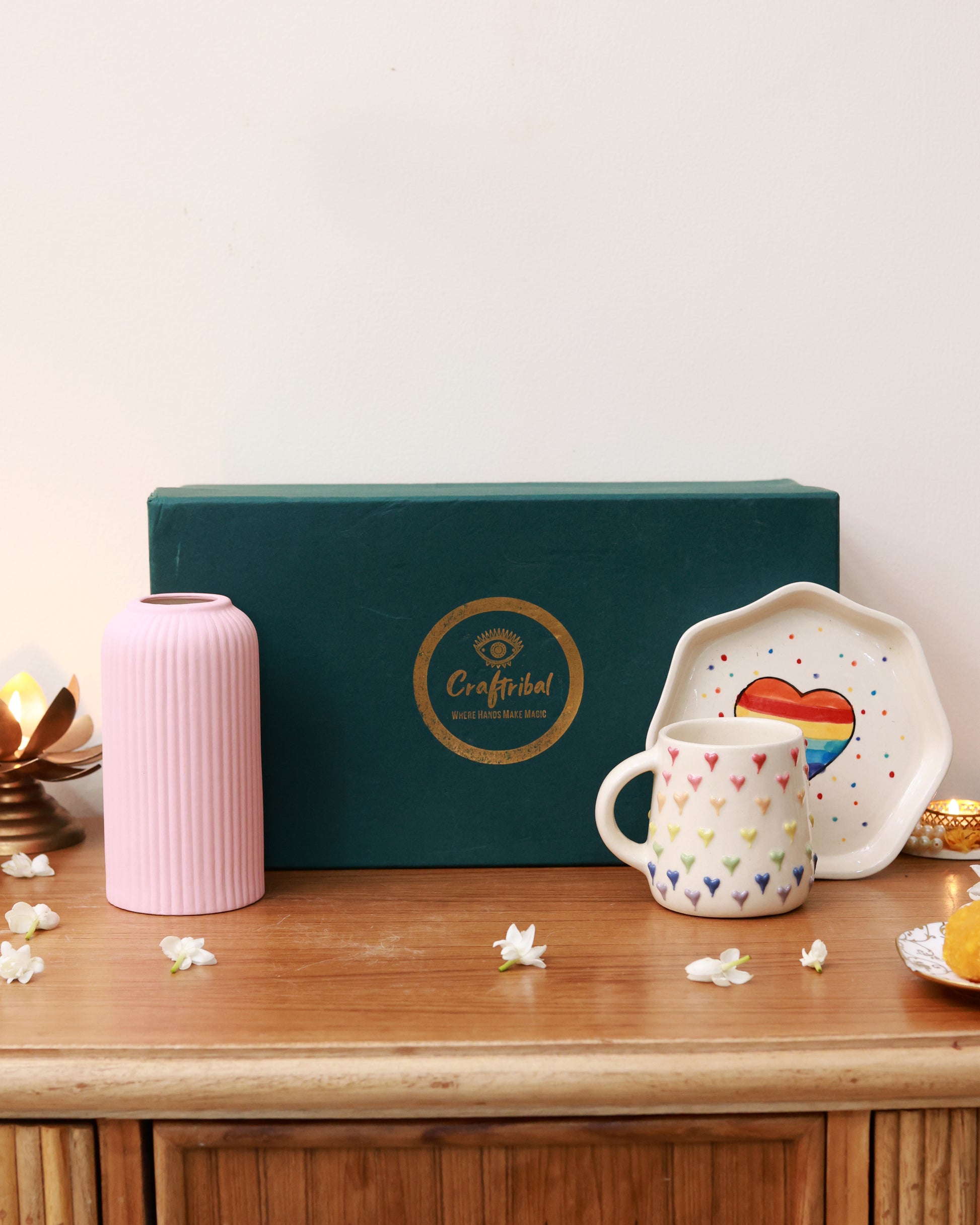 Celebrate love in every color with CraftRibal'sSpectrum of Love Gift Hamper. This vibrant set includes a Love's Spectrum Coffee Mug, a Rainbow Heart Dessert Plate, and a stylish Ribbed Vase in Pink, all designed to brighten up your day. Elegantly packaged in CraftRibal's signature gift box, this hamper makes a perfect gift for those who appreciate a blend of warmth and style. Whether for a special occasion or to add a splash of color to your home, the Love & Comfort Gift Hamper is sure to bring joy and comfort.