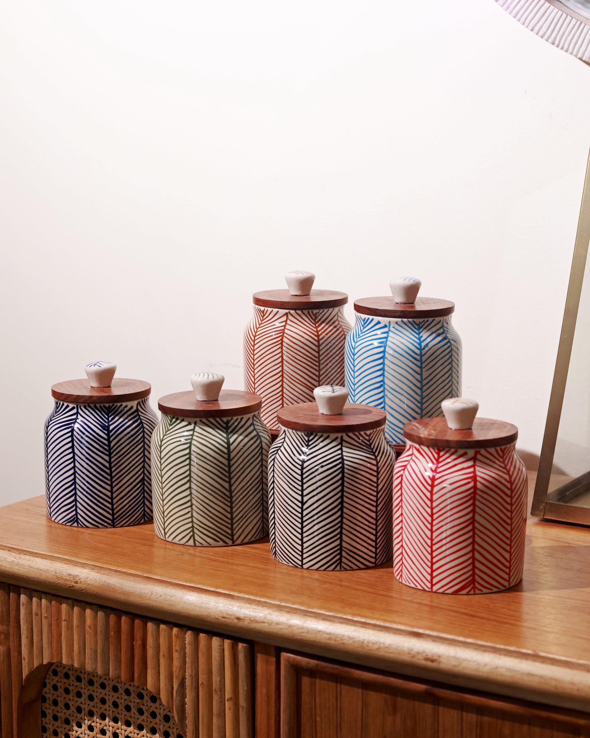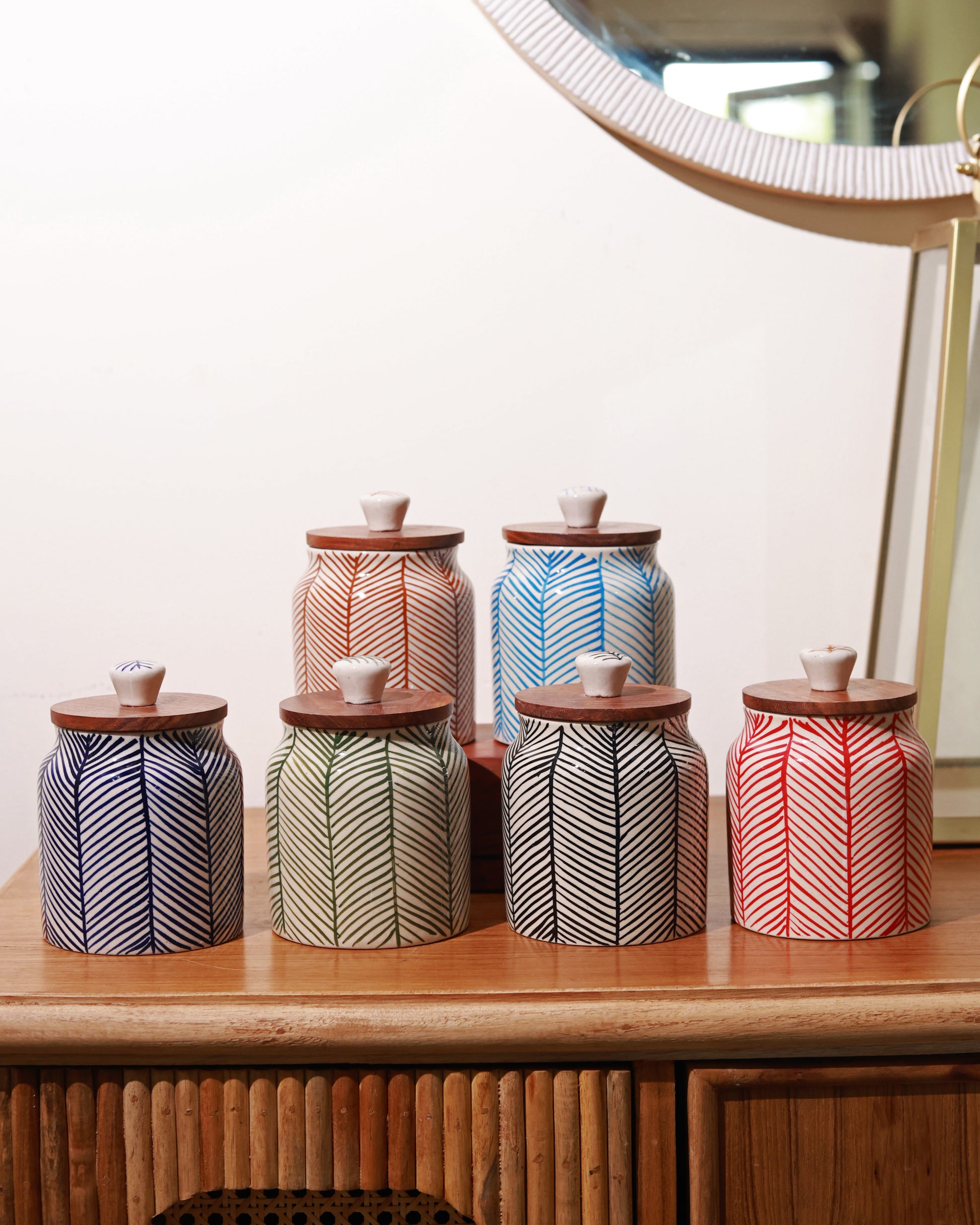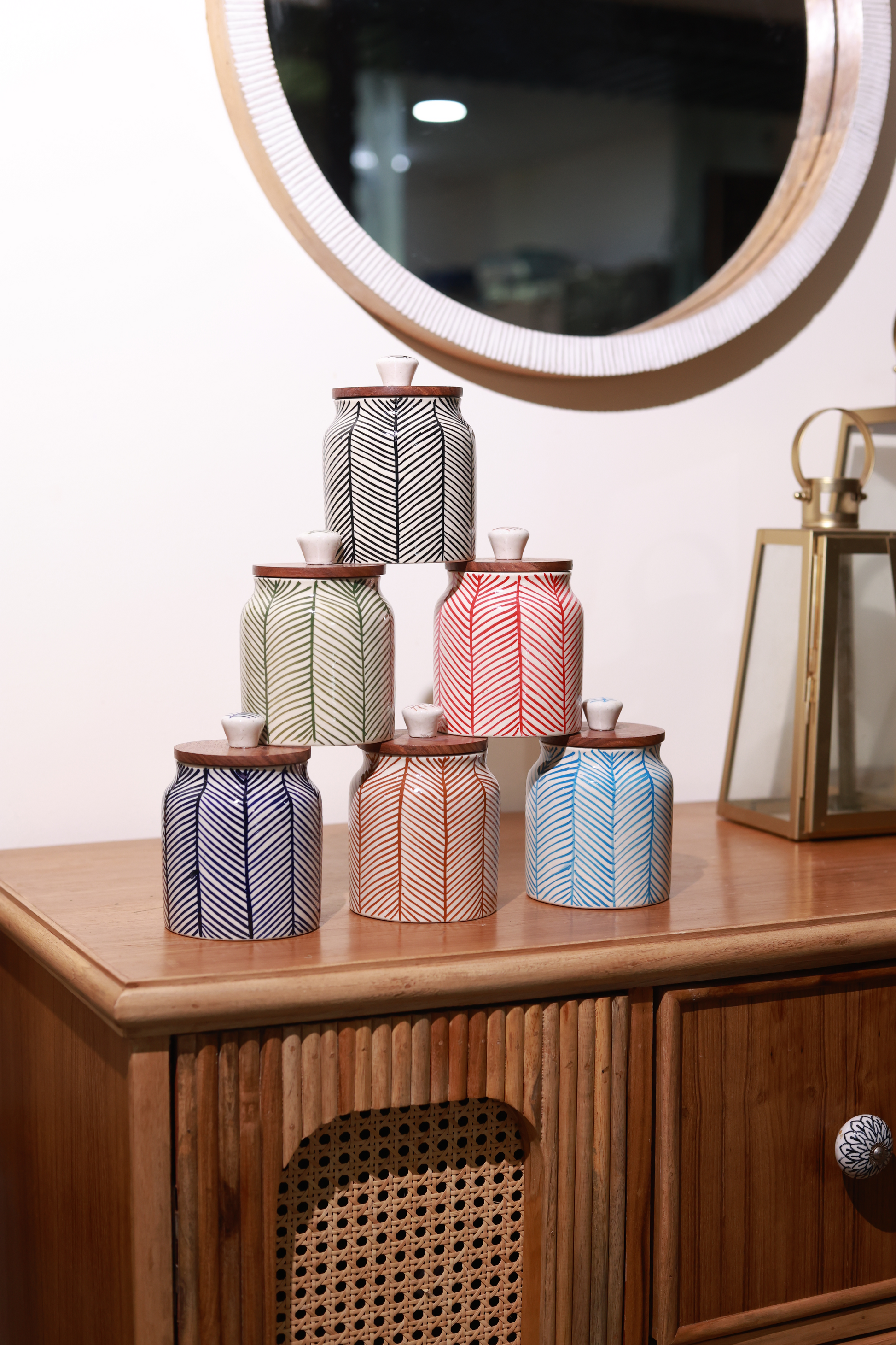 Description - Discover the perfect blend of functionality and elegance with our Hand Painted chevron striped Airtight Jars featuring a natural wooden lid. These premium jars are meticulously crafted with intricate embossing, adding a touch of sophistication to your kitchen or pantry. Hand Embossed Airtight Jars,Wooden Lid,Elegant Storage Solutions, Premium Kitchen Jars,Airtight Storage Jars Ideal for storing dry goods, coffee, tea, spices, and more, the airtight seal ensures your contents stay fresh and flavorful. Upgrade your storage solutions with these stylish and durable jars today!
