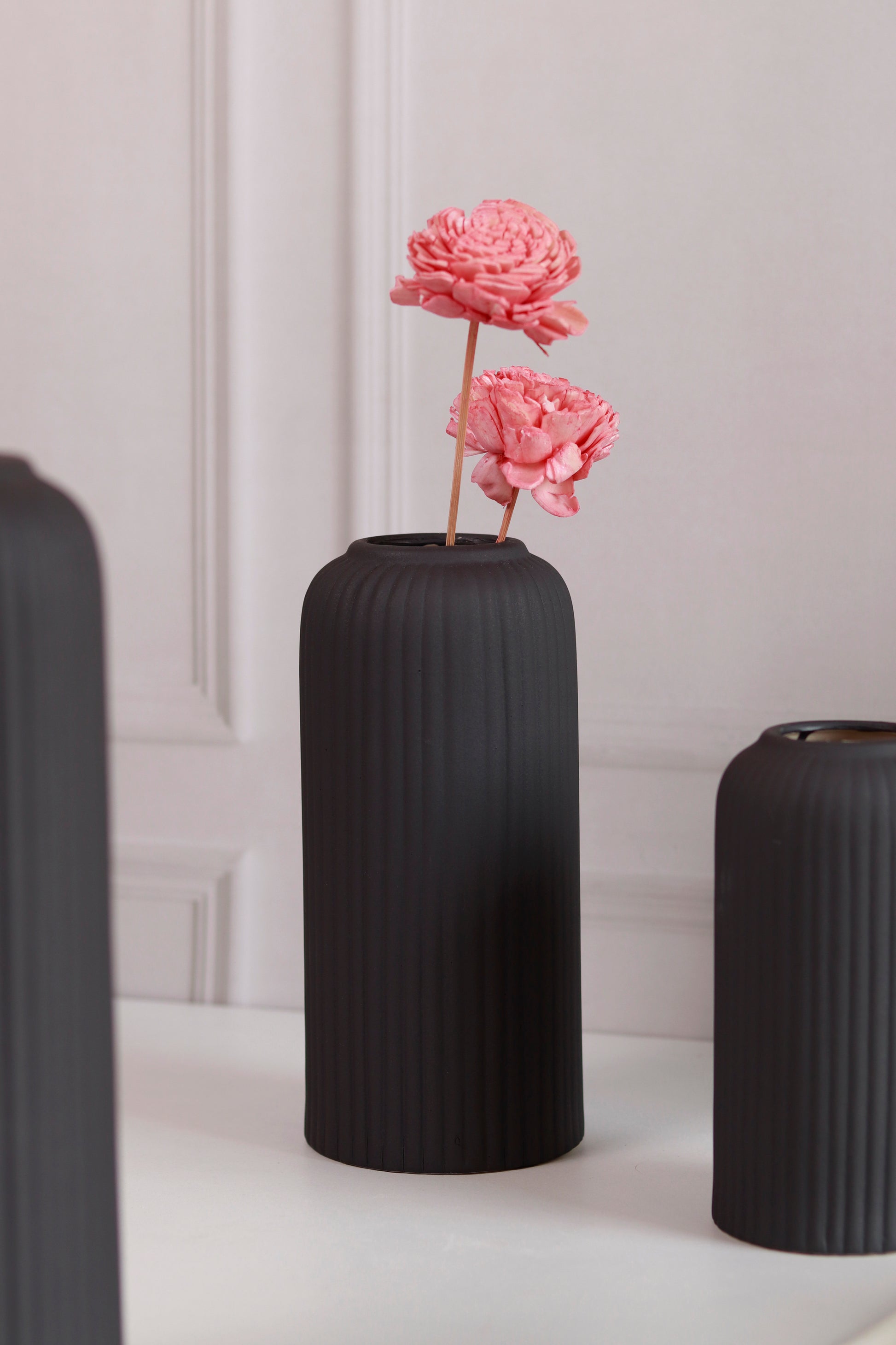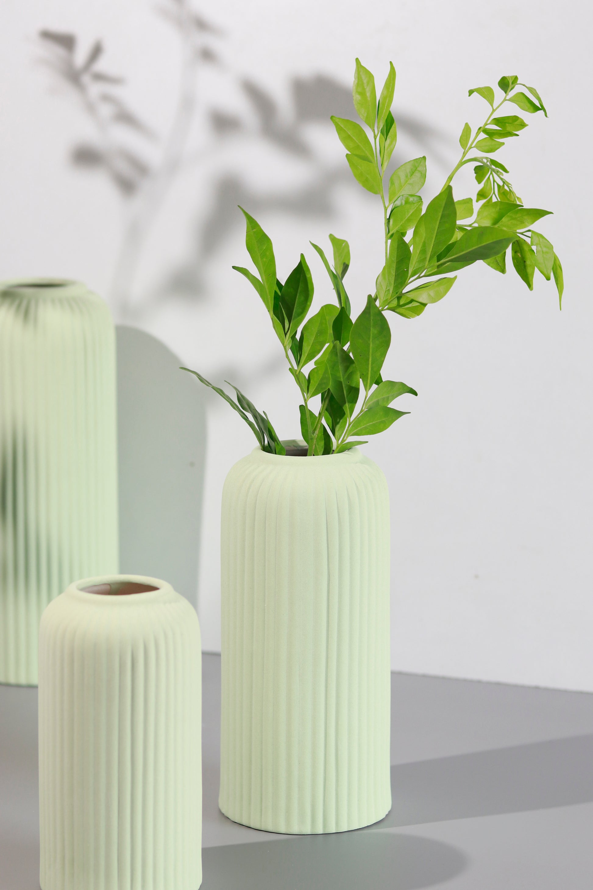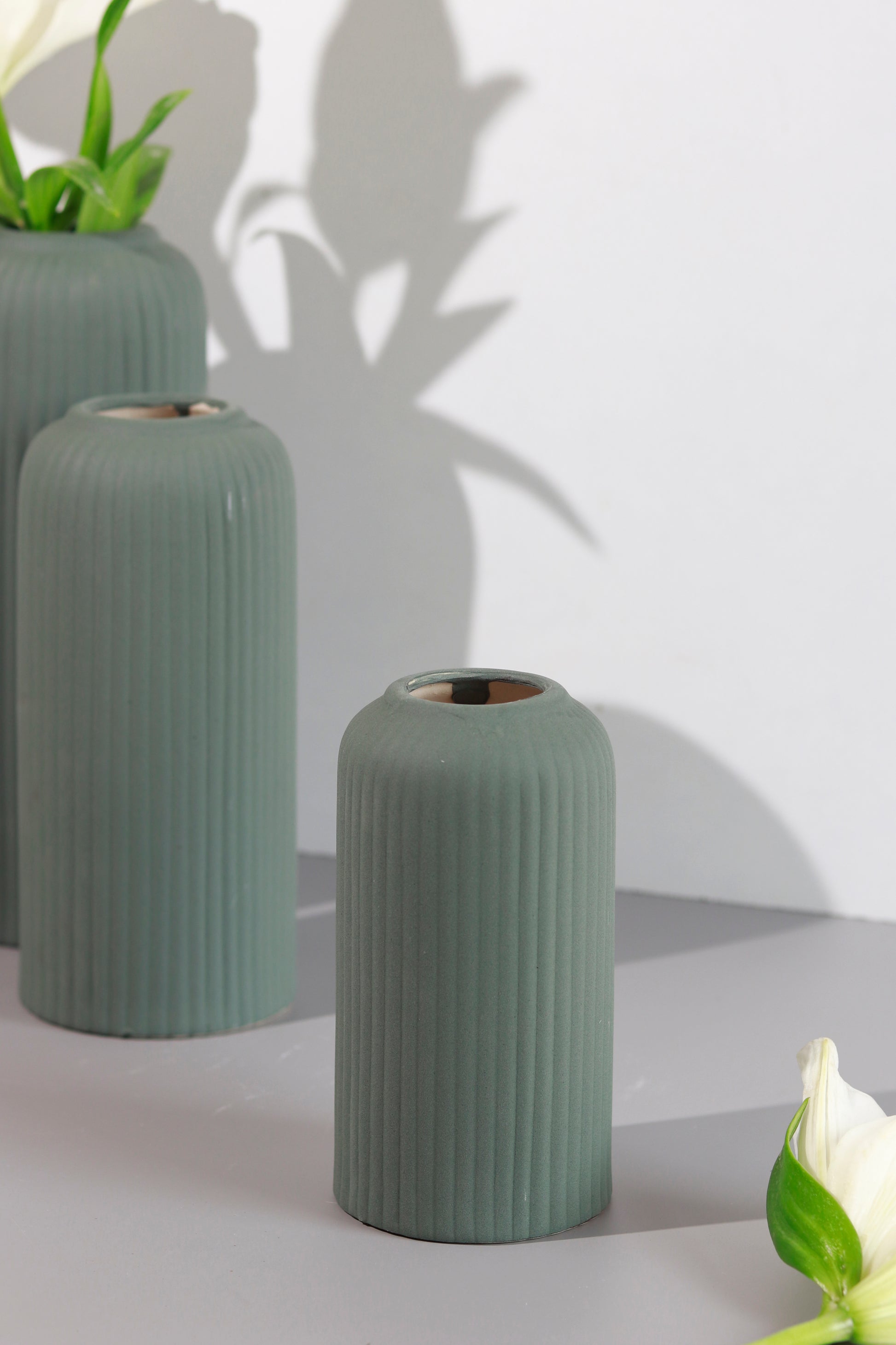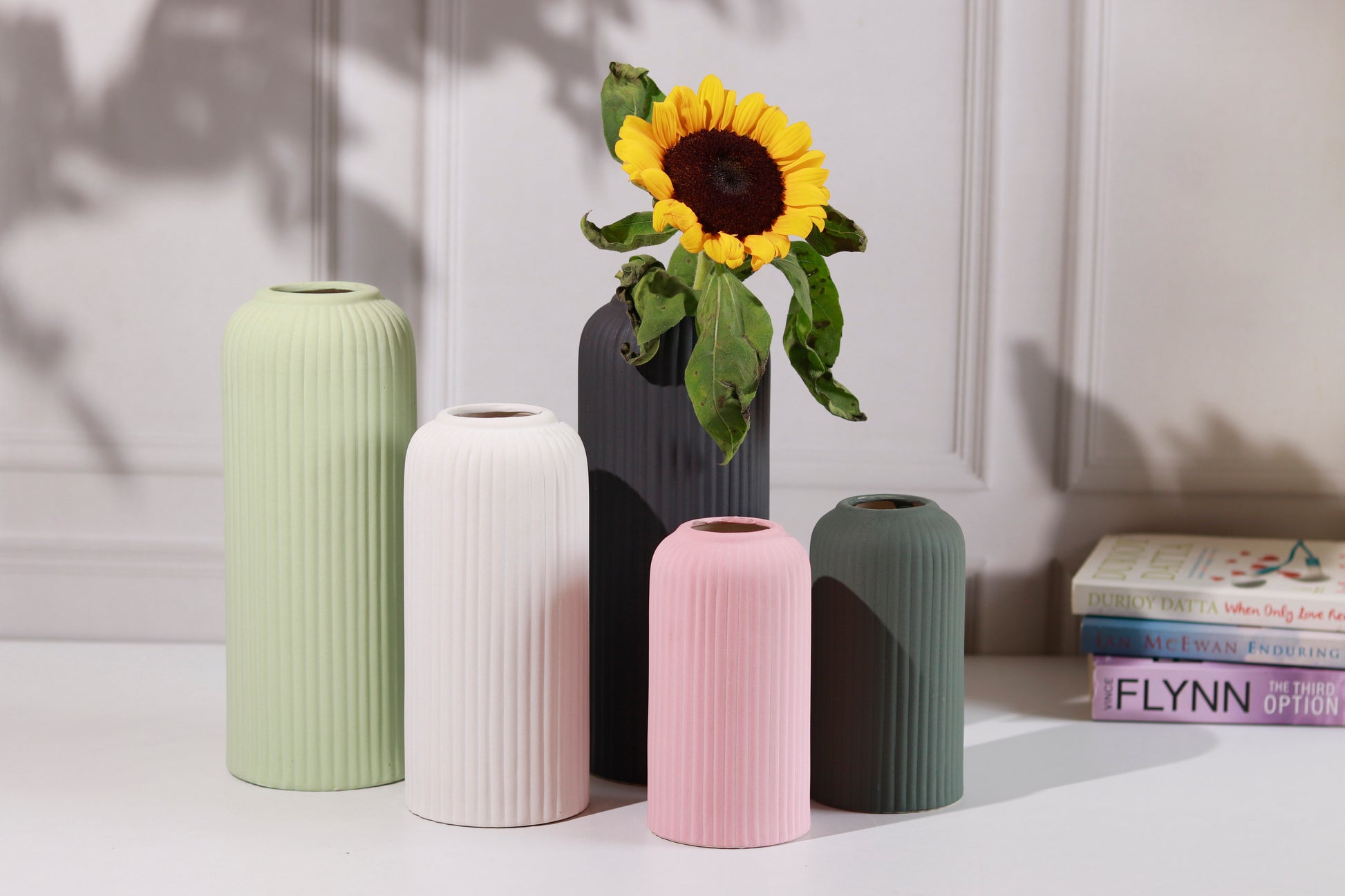 Package Inclusions- 1 Large Black vase, 1 Large Light Green Vase, 1 Medium White Vase, 1 Small Pink Vase, 1 Small Dark Green Vase